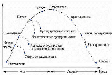 По Адизесу этапы жизненного цикла организации делятся на две группы: рост и старение. Согласно точке зрения Адизеса, организация зарождается и через некоторое время достигает расцвета, после чего неминуемо наступает старение, заканчивающееся ликвидацией организации.