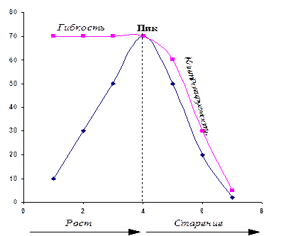 Анализ динамики развития организации в традиционной школе базируется на принципах гибкости и контролируемости. Адизес утверждает, что между развитием организации и человека существуют некоторые схожести, кроме одной: человек неминуемо смертен, тогда как организация – нет. Достижение точки, назовем ее «точка пика», в традиционной школе рассматривается как точка перелома кривой.