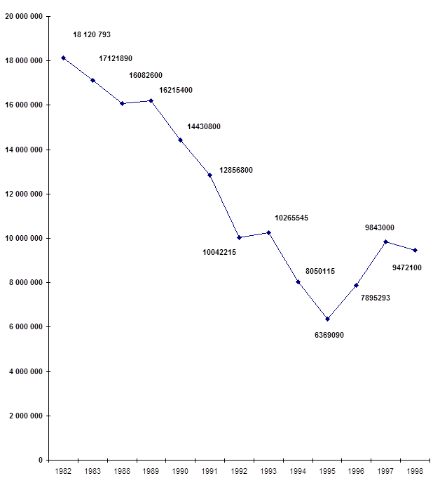 В 1997г. добыча нефти по ОАО “Самаранефтегаз” составила 8 млн. 160 тыс. т., а в 1998г. всего 7 млн. 238 тыс. т. Существенная часть фонда скважин нерентабельна. Речь идет о 15-20 % от всех действующих сегодня скважин. Следствием нерентабельности стала слишком высокая себестоимость добычи. Именно поэтому сегодня с новой силой заговорили о том, чтобы привести численность работающих в соответствие с реальными объемами производства, о реорганизации производств и необходимости освободиться от убыточных предприятий и месторождений. Сделать это можно несколькими способами, в том числе за счет консервации, которая требует немало средств, хотя их ни у кого сегодня нет. Можно предполагать, что в процессе реорганизации и выделения подразделений АО выживут далеко не все.