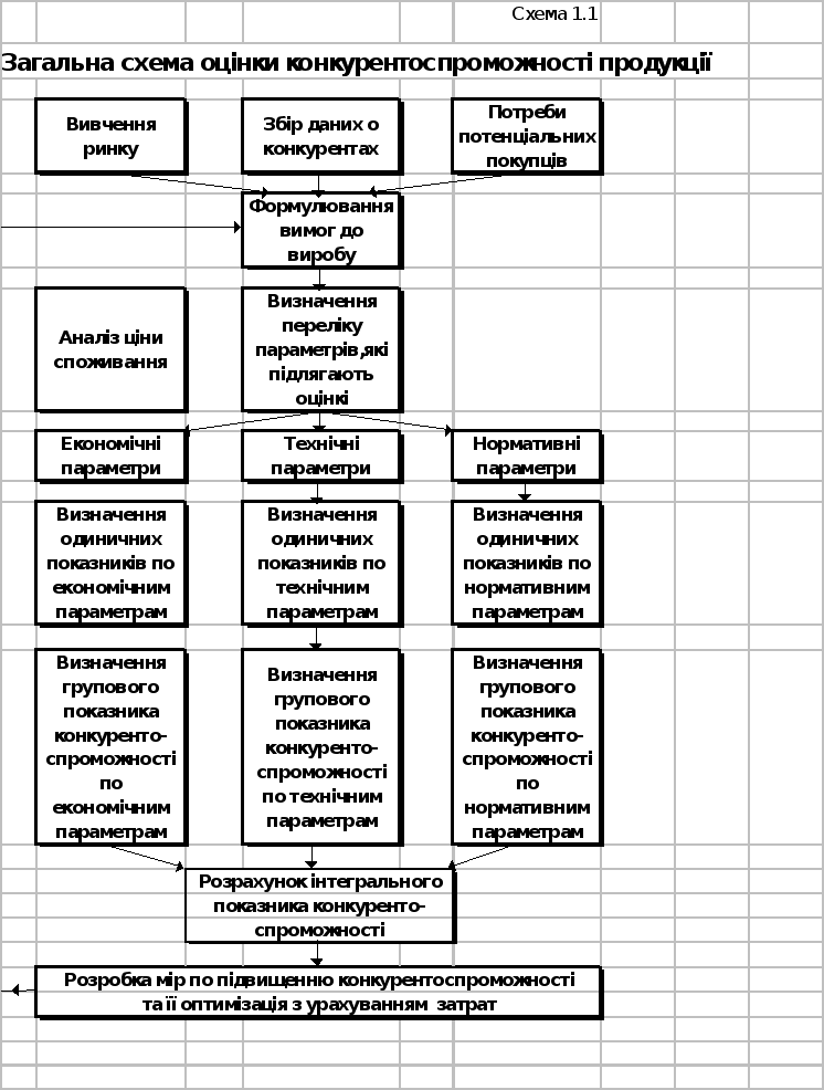 Конкурентоспроможність визначається сукупністю властивостей цієї продукції, які входять в склад її якості та важливих для споживача, визначають затрати споживача при купуванні, вживанні (експлуатації) та утилізації продукції. Загальна схема оцінки конкурентоспроможності представлена на схемі 1.1.[ стр.93]