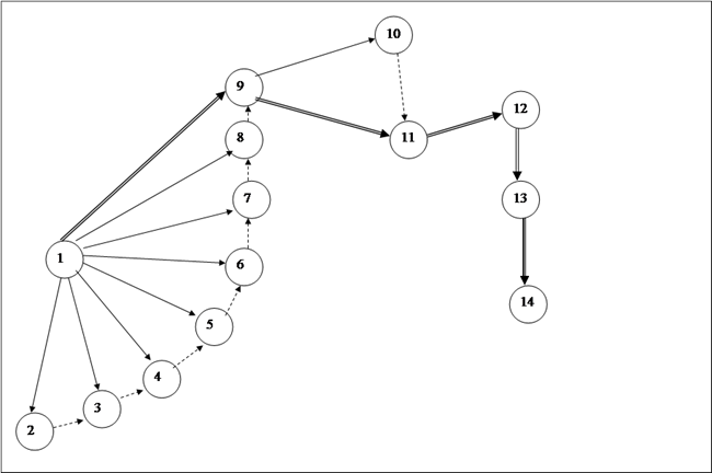 Путь – это непрерывная последовательность работ, начиная от исходного события и заканчивая завершающим. Путь, имеющий наибольшую продолжительность называется критическим путем и изображается двойной линией.