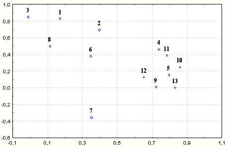 В результате факторного анализа мы получили следующее распределение оценок экспертов относительно описанных ранее тринадцати ключевых факторов успеха (на рис. 6 представлен двумерный график ):