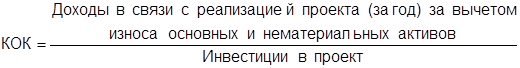 ные и перспективные проекты, которые не только обеспечат заданный уровень доходности, но и укрепят рыночные позиции фирмы. Высокий уровень риска (зависимость ожидаемой выручки от изменения цен на ресурсы, ссудного процента, темпов инфляции, валютного курса и других независящих от предприятия факторов) может быть компенсирован повышенной эффективностью вложений. Для ее оценки в первом приближении используется коэффициент окупаемости капиталовложений (КОК).