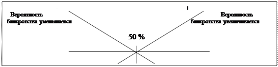 В приложении № 2 приведены Z-значения и вероятности банкротства по показателям двух коэффициентов, а таблица в приложении № 3 показывает типичные состояния предприятий, идущих прямиком к банкротству. На рисунке 2 схематично отражена вероятность наступления банкротства.