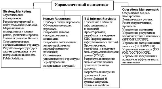 Подробнее остановимся на услугах, которые предоставляются компаниями, занимающимися управленческим консалтингом (см. схему).