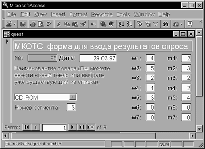 Для расшифровки и накопления данных формируют базы с интерфейсом для ввода результатов опроса (рис. 2.4). Представим, что наш опрос состоит из трех вопросов (два "закрытых" и один "открытый" - 3 ):