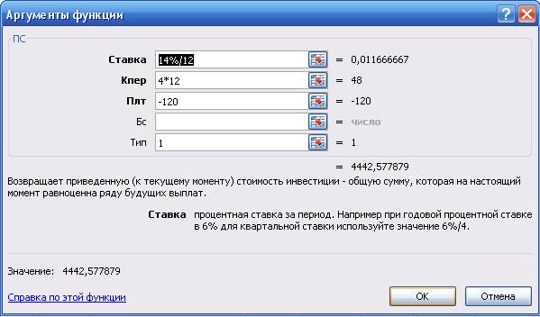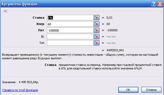 ПС – возвращает приведенную (к текущему моменту) стоимость инвестиций – общую сумму, которая на настоящий момент равноценна ряду будущих выплат.