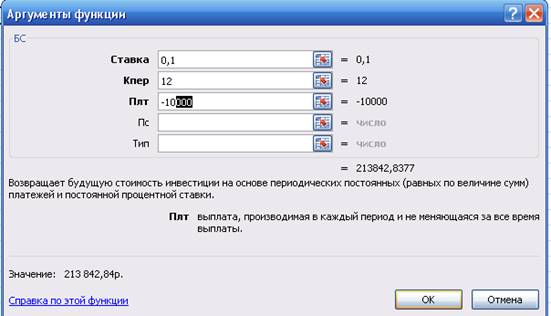 БС – возвращает будущую стоимость инвестиций на основе периодических постоянных (равных по величине сумм) платежей и постоянной процентной ставки.