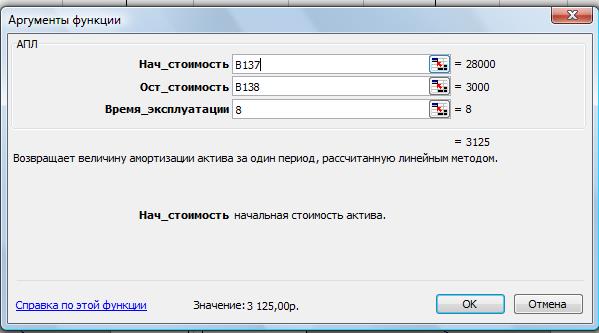 АПЛ – возвращает величину амортизации актива за один период, рассчитанную линейным методом.