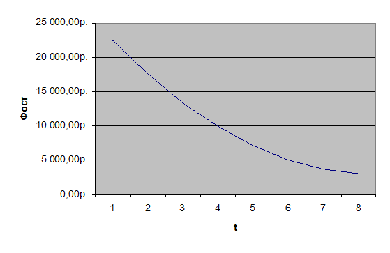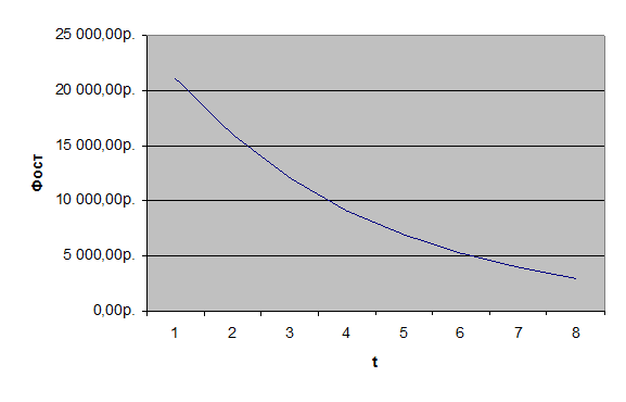 Рисунок 3 - Зависимость балансовой остаточной стоимости от срока эксплуатации при расчете амортизационных отчислений методом фиксированного уменьшения остатка.