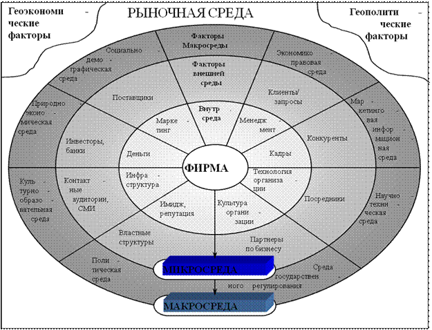 Рыночная среда интегрирует в себе корпоративные усилия по маркетингу, силы и факторы микросреды, непосредственно связанные с деятельностью фирмы, глобальные факторы, действующие фирмы, глобальные факторы, действующие в масштабах национальных и мировых рынков сбыта. Поэтому каждая компания вынуждена научиться учитывать совокупные факторы макро- и микросреды, овладеть мастерством их прогнозирования и, по возможности, регулирования.