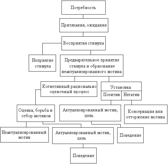 В случае предварительного принятия стимула дальнейший путь волевого импульса (неактуализированного мотива) как бы раздваивается. Его быстрая актуализация и кратчайший путь к действиям обеспечивается при наличии соответствующей установки. Она характеризует готовность и предрасположенность человека к определенному поведению (активности) в конкретной ситуации и как бы связывает притязания и ожидания с прошлым опытом действий в аналогичных условиях. Установка может быть позитивной или негативной в зависимости от того, как влиял прошлый опыт действий на реализацию потребности.