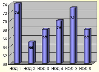 | Рис. 6. Средние значения показателей факторов мотивации командиров среднего звена по отделениям за 2003 г. |
