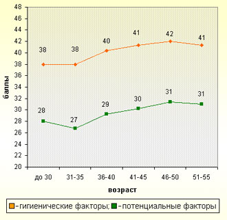 Сравнение средних значений показателей отдельных факторов мотивации показало, что по потенциальным факторам они примерно на 20% выше, чем по гигиеническим, независимо от возраста, пола и принадлежности к отделению дороги. Это означает, что для командиров среднего звена бoльшую долю в трудовой мотивации составляют содержание деятельности, сама работа, успехи, связанные с ней, и уже во вторую - условия труда (рис. 1). При этом диапазон изменения потенциальных и гигиенических факторов составляет 0-48 баллов. Максимальная оценка по общей мотивации - 96 баллов.