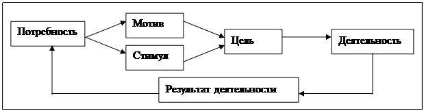 Как видно из рисунка, процесс мотивации начинается с какой-либо ощущаемой неудовлетворенной потребности, нужды. Затем определяется цель, которая предполагает, что для удовлетворения потребности требуется некое направление действий, посредством которых может быть достигнута цель и начаться удовлетворение потребности.
