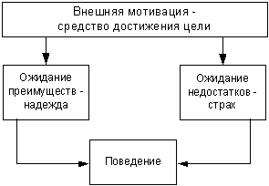 Внешняя мотивация – это средство достижения цели, например, заработать деньги, получить признание, занять вышестоящую должность. При этом она может использоваться в двух направлениях: как стимул при ожидании преимуществ – принцип надежды; как средство давления при ожидании недостатков – принцип страха. Внешняя мотивация непосредственно влияет на поведение, но эффективность ее действия ограничена, пока она воспринимается в качестве стимула или давления.