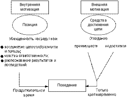Внутренняя мотивация – это понимание смысла, убежденность. Она возникает в том случае, если идея, цели и задачи, сама деятельность воспринимаются как достойные и целесообразные. При этом создается конкретное состояние, определяющее направленность действий, а поведение станет результатом соответствующей внутренней установки, причем это справедливо не только для человека. Многие организации начинали создавать систему качества из-за внешней мотивации: надежды на преимущества в конкурентной борьбе и укрепление позиции на рынке, страх несоответствия продукции будущим стандартам качества и потери рынка создавали ее основу. Другие предприятия решаются на внедрение философии качества, основываясь на убеждении, что предупреждение появления бракованных изделий должно стать их принципиальной позицией в мире производства. Такая позиция справедлива для многих сфер жизни. В этом случае речь идет о внутренней мотивации. Внутренняя мотивация присутствует, если идея, задача или деятельность воспринимаются целесообразными и чего-то стоящими. Необходимо чувствовать себя ответственным за это и быть в состоянии прогнозировать результаты. Тогда поведение станет результатом, вытекающим из соответствующей установки.