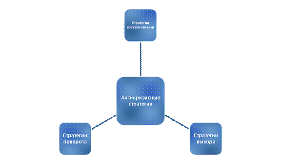 В предкризисной и кризисной ситуации происходит определенная антикризисная трансформация системы традиционных стратегий. Одни из них могут реализовываться более активно, осуществление других временно приостанавливается или происходить менее интенсивно, другие которые обычно в организации не использовались на период выхода их кризиса берутся на вооружение и так далее.