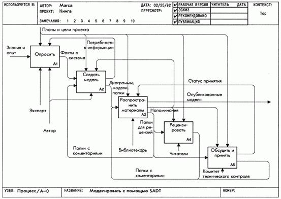 В процессе SADT-моделирования рекомендуется выделить специальную группу людей, ответственных за то, что создаваемая в процессе анализа модель будет точна и используема в дальнейшем. Эта группа, называемая Комитетом технического контроля (см. блок 5 на рис. 2.1.), отвечает за контроль качества моделей, создаваемых авторами SADT-проекта. Комитет следит за выполняемой работой и ее соответствием конечным целям всего проекта. Члены Комитета обсуждают модель и оценивают, насколько она может быть использована и будет использована соответствующим образом в ходе выполнения проекта для достижения его глобальных целей.
