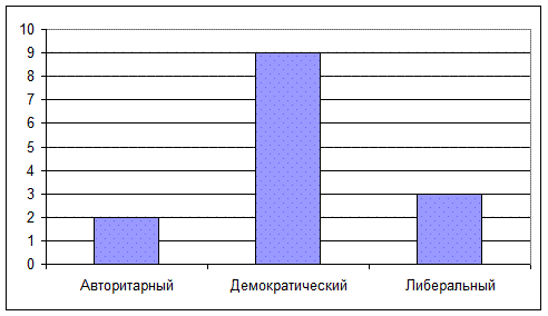 С начальником отдела контроля исполнения муниципальных закупок было проведено тестирование «Самооценка стиля персонала». Исходя из результатов можно сделать вывод, что начальнику отдела присущ демократический стиль руководства. Так как авторитарный и либеральные стили руководства на достаточно низком уровне – это может говорить о неспособности руководителя смешивать различные стили управления. Использование одного демократического стиля может повлечь за собой безразличие к своему труду у сотрудников.