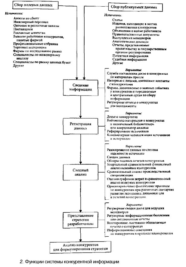 Очевидно, чтобы получить данные для всестороннего анализа, одной упорной работы недостаточно. Эффективный сбор информации требует организованного механизма — своего рода системы конкурентной разведки. Элементы этой системы могут изменяться в зависимости от конкретных нужд фирмы, отрасли, в которой она конкурирует, возможностей персонала, интересов и способностей менеджмента. На рис. 3.2 представлены функции, необходимые для получения данных для анализа, и некоторые варианты осуществления этих функций. В некоторых компаниях все эти функции могут эффективно осуществляться одним лицом, однако это скорее исключение, чем правило. Существует множество источников как полевых, так и публикуемых данных, многие работники компании, как правило, могут внести свой вклад в их получение. Кроме того, одному работнику, как правило, не под силу эффективная работа по сбору, регистрации, обобщению и представлению всей этой информации.