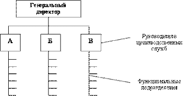 Функциональная структура сложилась как неизбежный результат усложнения процесса управления. Особенность функциональной структуры заключается в том, что хотя и сохраняется единоначалие, но по отдельным фикциям управления формируются специальные подразделения, работники которых обладают знаниями и навыками работы в данной области управления (рис.2).
