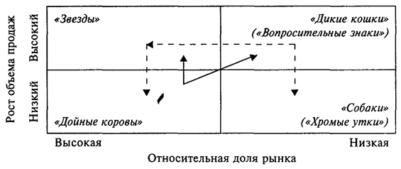 Наконец, в правом нижнем секторе находятся «собаки», или «хромые утки». Это продукты с ограниченным объемом сбыта (маленькая доля на рынке) в зрелой или сокращающейся отрасли (медленный рост). Несмотря на достаточно длительное присутствие на рынке, им не удалось привлечь к себе достаточное количество потребителей и они значительно отстают от конкурентов по объему сбыта. От этих продуктов необходимо избавляться как можно быстрее, так как держать на рынке «больной» продукт чрезвычайно убыточно. Более того, их присутствие на рынке может нанести ущерб репутации предприятия.