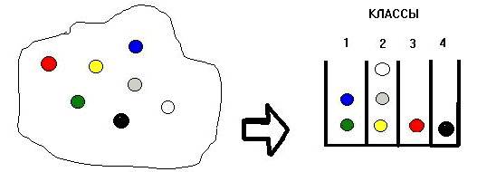 Слева изображено неструктурированное множество альтернатив. Справа показано разбиение исходного множества на 4 класса. Можно считать, что каждый класс есть подмножество исходного множества альтернатив. Здесь важно отметить, что классы НЕУПОРЯДОЧЕНЫ друг относительно друга. Т.е. нельзя сказать, что какой-то класс "важнее (лучше, старше, дороже и п.т.)" другого. Например, людей можно классифицировать по полу или национальности. Правильная постановка диагноза - также пример классификации. Компьютерные системы, помогающие врачу ставить диагноз, существуют. И решают они именно задачу классификации, т.е. отнесения больного к нужному классу, который эквивалентен названию болезни. (А как же быть с легкими и тяжелыми заболеваниями? Ведь по определению классы НЕ упорядочены. Действительно, заболевания можно упорядочивать по тяжести, но здесь мы договоримся не принимать это в расчет.)
