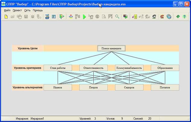 Для наглядного применения программы «Выбор» попытаемся решить следующую задачу. Нам необходимо произвести отбор кандидатов на освободившуюся должность заместителя начальника отдела информатизации из числа сотрудников отдела. Кандидатов будем оценивать по нескольким критериям: стаж работы в организации, ответственность, образование, коммуникабельность. Мы имеем 4-х претендентов на эту должность.