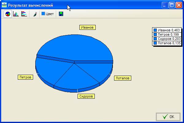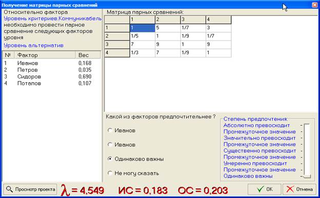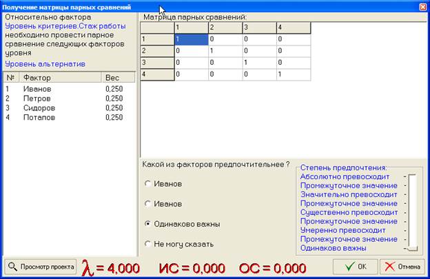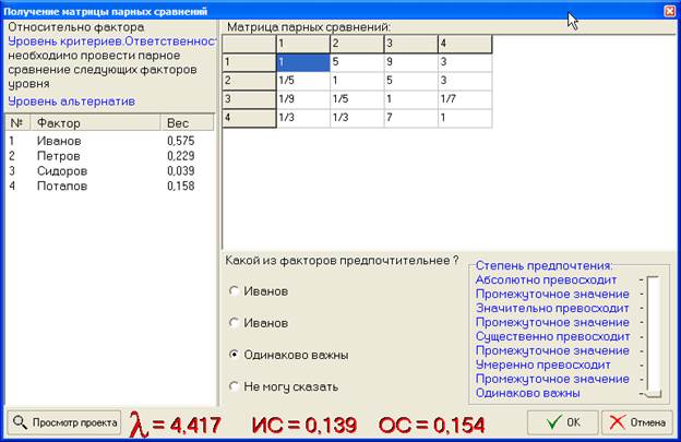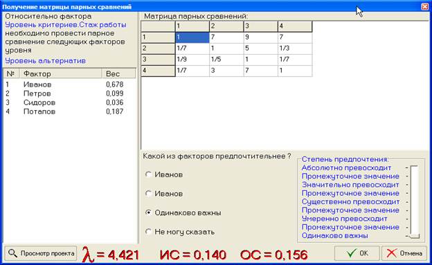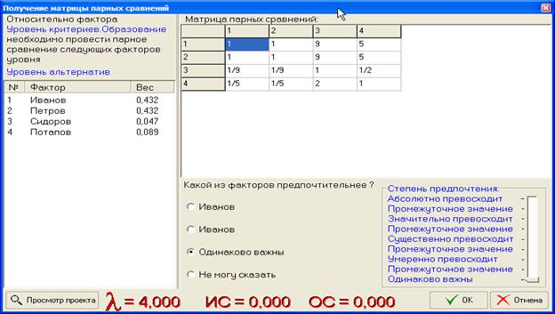 Затем мы запускаем выполнение вычислений, где нам необходимо относительно каждого уровня произвести оценку нескольких факторов, тем самым расставив предпочтения (рис. 4)