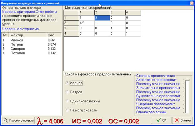 Для каждого критерия производим оценку, допустим по стажу работы Иванов имеет большее предпочтение так как он проработал на нашем предприятии дольше Петрова. (рис. 5)