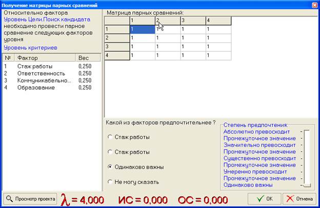 Относительно кандидатов мы расставили оценки по критериям. А как же оценки относительно самой цели? Что для нас является важнее? Стаж, образование, коммуникабельность или ответственность? Думаю уровняем шансы, нам нужен кандидат в равной степени удовлетворяющий всем параметрам. Расставляем приоритеты поровну. (рис. 10)