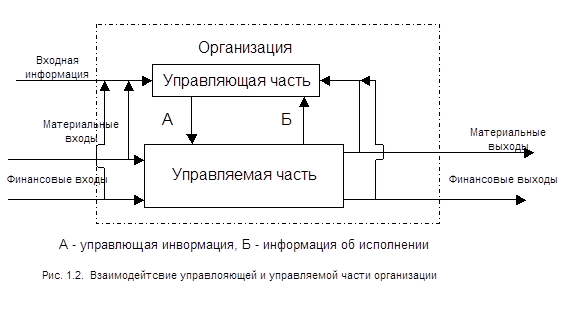 Процесс управления предусматривает согласованные действия, которые обеспечивают осуществление общей цели или набора целей, стоящих перед организацией. Для координации действий должен существовать специальный орган, реализующий функцию управление. Поэтому в любой организации выделяется управляемая и управляемые части. Схема взаимодействия между ними показана на рис. 1.2 (7)