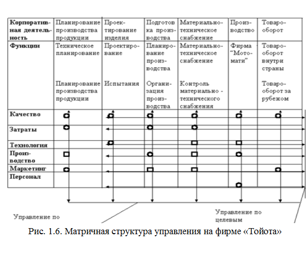 Основы линейных структур составляет так называемый "шахтный" принцип построения и специализация управленческого процесса по функциональным подсистемам организации (маркетинг, производство, исследования и разработки, финансы, персонал и т. д. ). По каждой подсистеме формируется иерархия служб ("шахта"), пронизывающая всю организацию сверху донизу (см. рис. 1.3.). Результаты работы каждой службы оцениваются показателями, характеризующими выполнение ими своих целей и задач. Соответственно строится и система мотивации и поощрения работников. При этом конечный результат (эффективность и качество работы организации в целом) становится как бы второстепенным, так как считается, что все службы в той или иной мере работают на его получение.