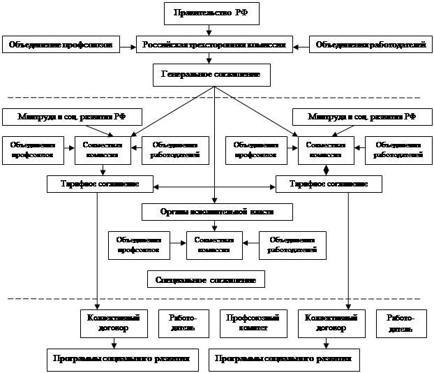 На уровне организации регулирование социально-трудовых отношений осуществляется с помощью системы коллективных договоров, в рамках которых определяются согласованные позиции работников той или иной организации и их работодателей по решению важнейших вопросов условий и оплаты труда, социальных выплат и компенсаций, социального обеспечения и страхования и т.д. Многоуровневая система регулирования социально-трудовых отношений в Российской Федерации представлена на рис. 2.