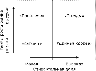 При анализе портфеля продукции, то есть вариантов инвестиций, сравнивают долю фирмы или ее изделий на рынке с темпами роста всей хозяйственной деятельности. Здесь может быть использована матрица Бостонской консультативной группы (рисунок 1.1), которая поможет при выборе той или иной стратегии. Например, если изделие фирмы занимает большую долю рынка и имеет высокие темпы роста "звезда", фирма, скорее всего, будет придерживаться стратегии роста, и наоборот, если изделие занимает малую долю рынка и имеет низкие темпы роста "собака", фирма может выбрать стратегию сокращения.