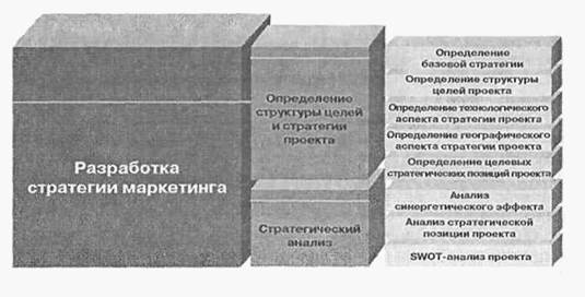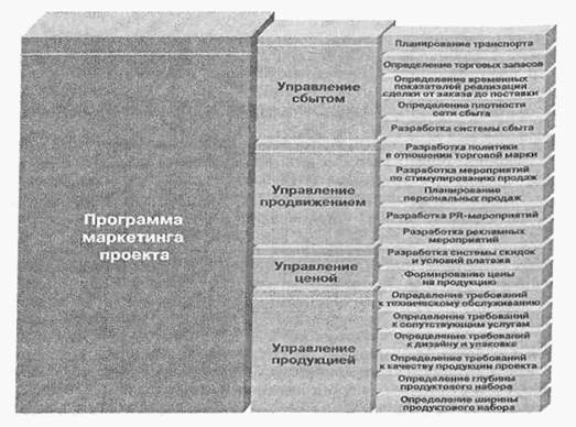Условно первый аспект можно определить как вертикальную (содержательную) структуру маркетинга проекта, а второй — как горизонтальную (временную) структуру маркетинга .