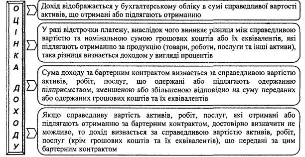 Доходи включаються до складу об'єктів облікового процесу на підставі принципу нарахування та відповідності. В бухгалтерському обліку дохід відображається в сумі справедливої вартості отриманих активів або тих, що підлягають одержанню. Критерії оцінки доходу показано на рис. 2.1.3.