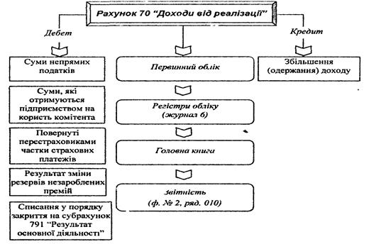 Узагальнення інформації про доходи від реалізації готової продукції, товарів, робіт і послуг, доходів від страхової діяльності, а також про суму знижок, наданих покупцям, та про інші вирахування з доходу ведеться на рахунку 70 "Доходи від реалізації”, загальну схема організації обліку зображено на рис. 2.1.4.