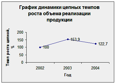 Изучив динамику реализации продукции за 2002 – 2004гг., можно сделать вывод о том, что деятельность предприятия имеет положительную тенденцию роста объемов реализации, но в то же время видно, что в 2003 году объем реализации увеличился больше, чем в 2004 году по сравнению с предыдущими периодами. Такой результат связан с тем, что в 2004 году был произведен капитальный ремонт здания одного из магазинов, что вызвало некоторый сбой в реализации продукции.