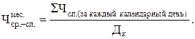 Месячная среднесписочная численность работников определяется суммированием их списочной численности на каждый календарный день месяца, включая выходные и праздничные дни, с последующим делением этой суммы на полное число календарных Дк дней месяца :
