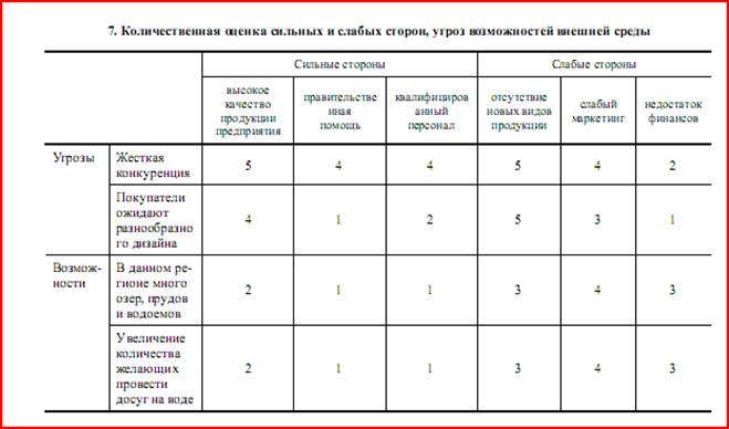 Вторым шагом анализа будет количественная оценка по 5-балльной шкале сочетания сильных и слабых сторон, угроз и возможностей внешней среды.