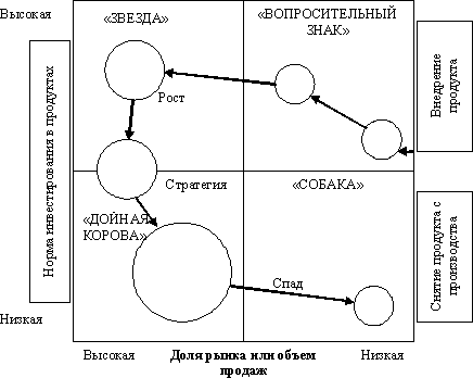 В идеале сбалансированный номенклатурный портфель предприятия должен включать 2–3 товара – "коровы", 1–2 – "Звезды", несколько "проблем" в качестве задела на будущее и, возможно, небольшое число товаров – "собак". Избыток стареющих товаров ("собак") указывает на опасность спада, даже если текущие результаты деятельности предприятия относительно хорошие. Избыток новых товаров может привести к финансовым затруднениям.