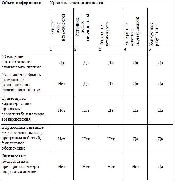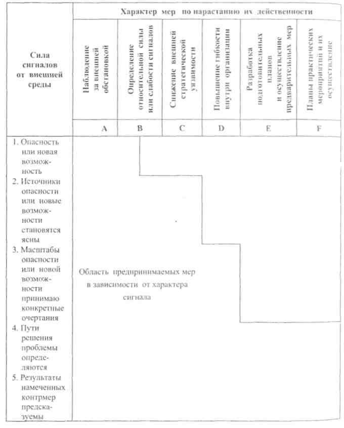 В первой колонке, сверху вниз, перечислены поступающие из внешней среды сигналы, сначала — слабые, а затем постепенно усиливающиеся. Вначале (уровень сигнала 1) можно быть уверенным только в том, что внешняя среда готовит какие-то неожиданности. На уровне 5 информационное обеспечение о возникающей проблеме увеличивается настолько, что уже можно рассчитать прибыли и убытки как от возникшей ситуации, так и от намеченных контрмер. На уровне 4 осведомленность является достаточной для того, чтобы разработать и внедрить конкретные меры в ответ на возникшую опасность или открывшуюся возможность, пусть даже организация еще не в состоянии оценить финансовые последствия своих решений.
