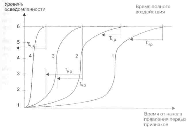 Кривая 3 достигает пятого уровня слишком поздно, чтобы успеть принять решительные меры противодействия. Как видно из графика, нормальные ответные меры следовало бы начать еще где-то между первым и вторым уровнями осведомленности, а чрезвычайные меры — на уровне 3-5. В этом случае необходимо начать поиски слабых сигналов. Кривая 4 означает «неустранимую неожиданность», так как даже чрезвычайные ответные меры следовало бы предпринять еще до того, как во внешней среде появятся первые признаки неминуемой опасности (первый уровень осведомленности).