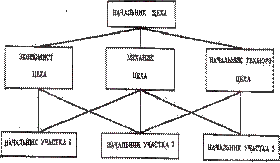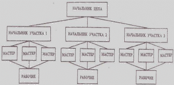 Линейная структура характеризуется непосредственным воздействием руководителя на управляющее звено по всем функциям управления. Линейный руководитель единолично отвечает за работу подчиненных звеньев. Ему подчинены руководители и исполнители нижестоящих подразделений, а он подчинен вышестоящему начальнику. Например, на уровне цеха линейная структура управления выглядит так, как показано на рис. 1.