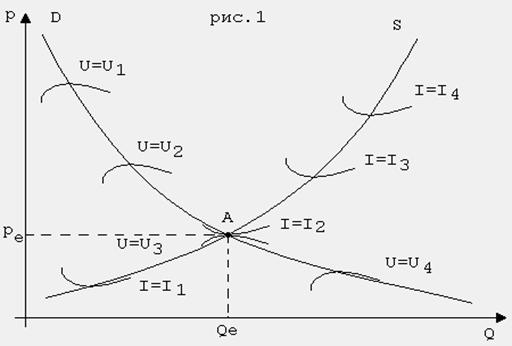 В силу свойств кривых спроса и предложения равновесное решение является устойчивым в том смысле, что если цена строго фиксирована и равна равновесной P=Pe , то товаропроизводитель, максимизируя прибыль, поставляет на рынок товар в количестве S(pe )=Qe ; одновременно потребитель, стремясь максимизировать полезность, предъявляет спрос D(pe )=Qe . При установлении на рынке совершенной конкуренции равновесной цены объем товаров, предлагаемый товаропроизводителем и доставляющий ему максимум прибыли по данной цене, в точности равен спросу потребителя.