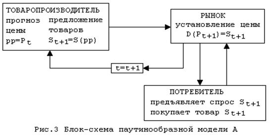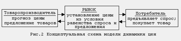 Концептуальная модель любого процесса динамики цен включает взаимодействие трех подсистем, которые можно условно назвать “товаропроизводитель”, “потребитель” и “рынок” (рис.2). Паутинообразная модель (модель А), в которой спрос отстает от предложения на один период: D(Pt+1 )=S(Pt ), также вписывается в схему рис.2.