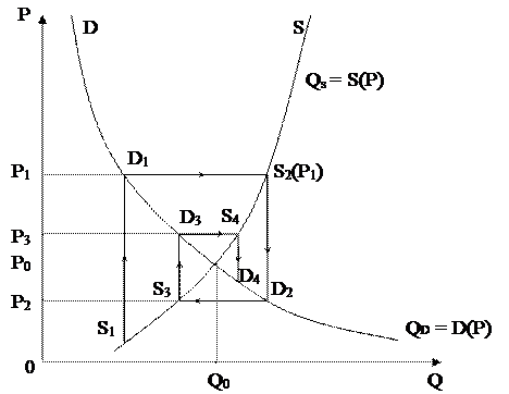 Использование монотонных функций спроса и предложения позволяет построить последовательность цен Pt , где t — номер шага во времени. Действительно, в силу гипотезы (1) товаропроизводитель по значению цены P1 при помощи кривой предложения определяет S2 ; в силу гипотезы (2) на рынке устанавливается цена P2 (находится при помощи кривой спроса); в силу гипотезы (3) весь товар в количестве S2 находит потребителя; в силу гипотезы (1) товаропроизводитель, ориентируясь на цену P2 , определяет объем предложения S3 и т.д. (рис.3). Далее рассмотренный процесс повторяется.