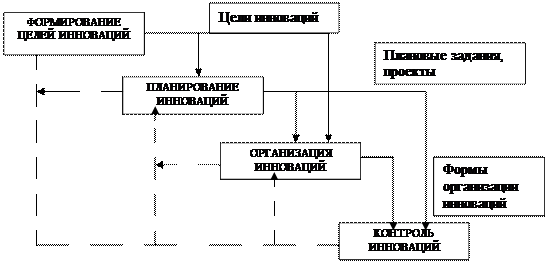 Основные предметные функции менеджмента определяют содержание процесса управления инновациями и включают формирование целей инновационной деятельности, планирование инноваций, организацию работ и контроль за осуществлением инноваций. Взаимосвязь и логическая последовательность осуществления основных функций в процессе управления инновациями представлены на рисунке 1